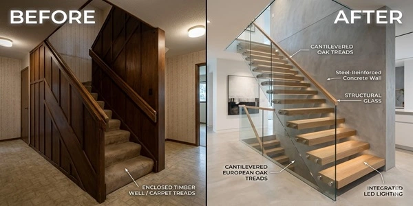 The staircase is the spine of the property. If your current stairs are creaky, poorly lit, or hidden behind outdated timber, they are holding back your home’s true potential and your daily comfort.